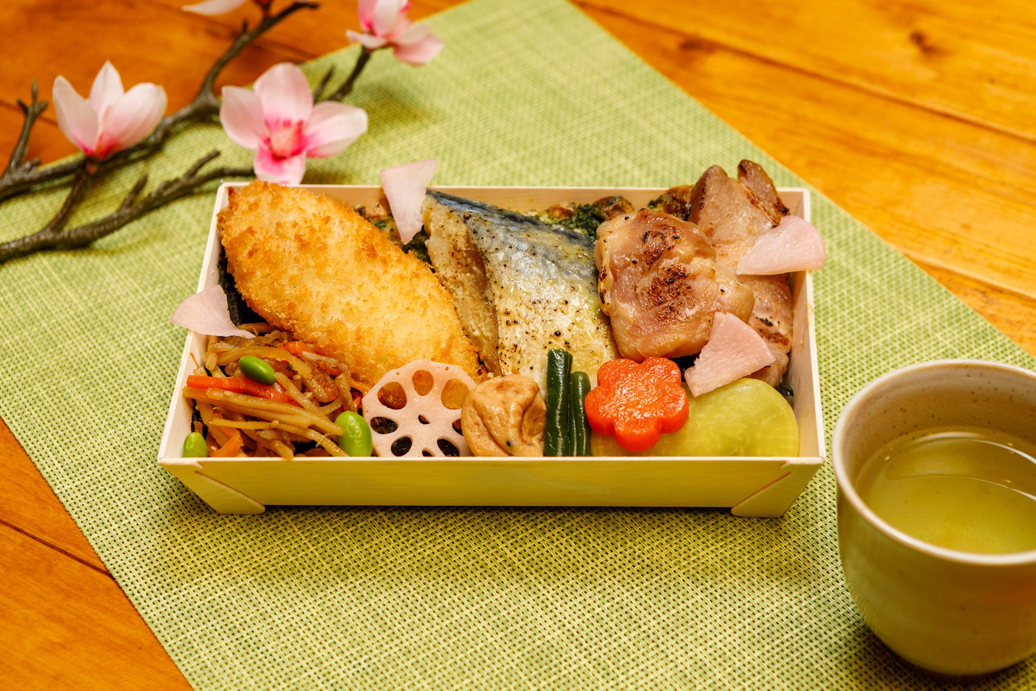 【2026年春限定海苔弁】鰆に木の芽味噌を塗り、香ばしく焼き上げた桜舞うお弁当です。全てのお弁当にお茶がつきます。