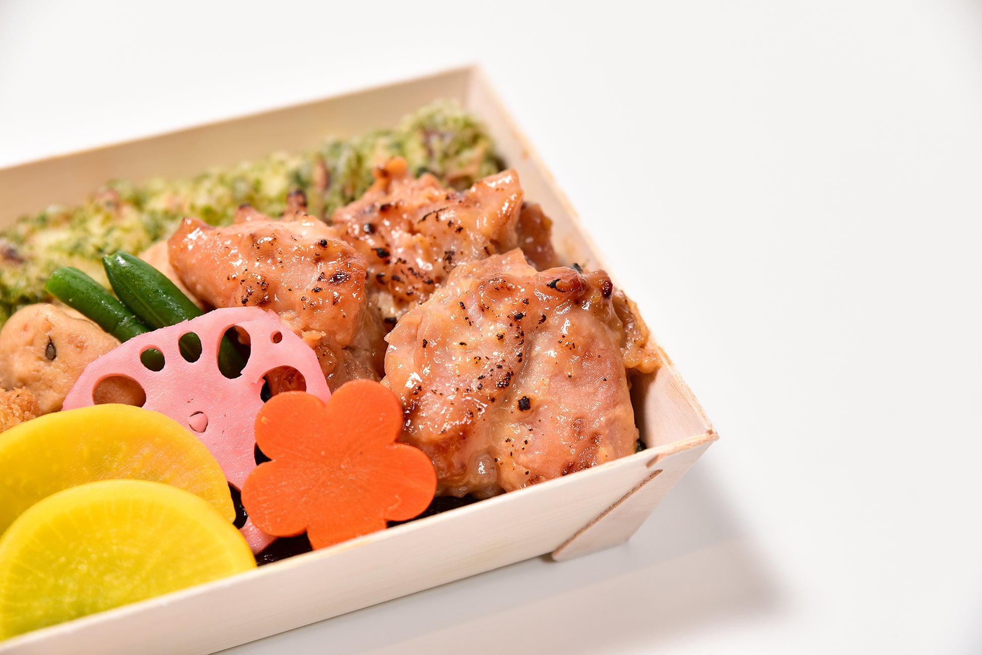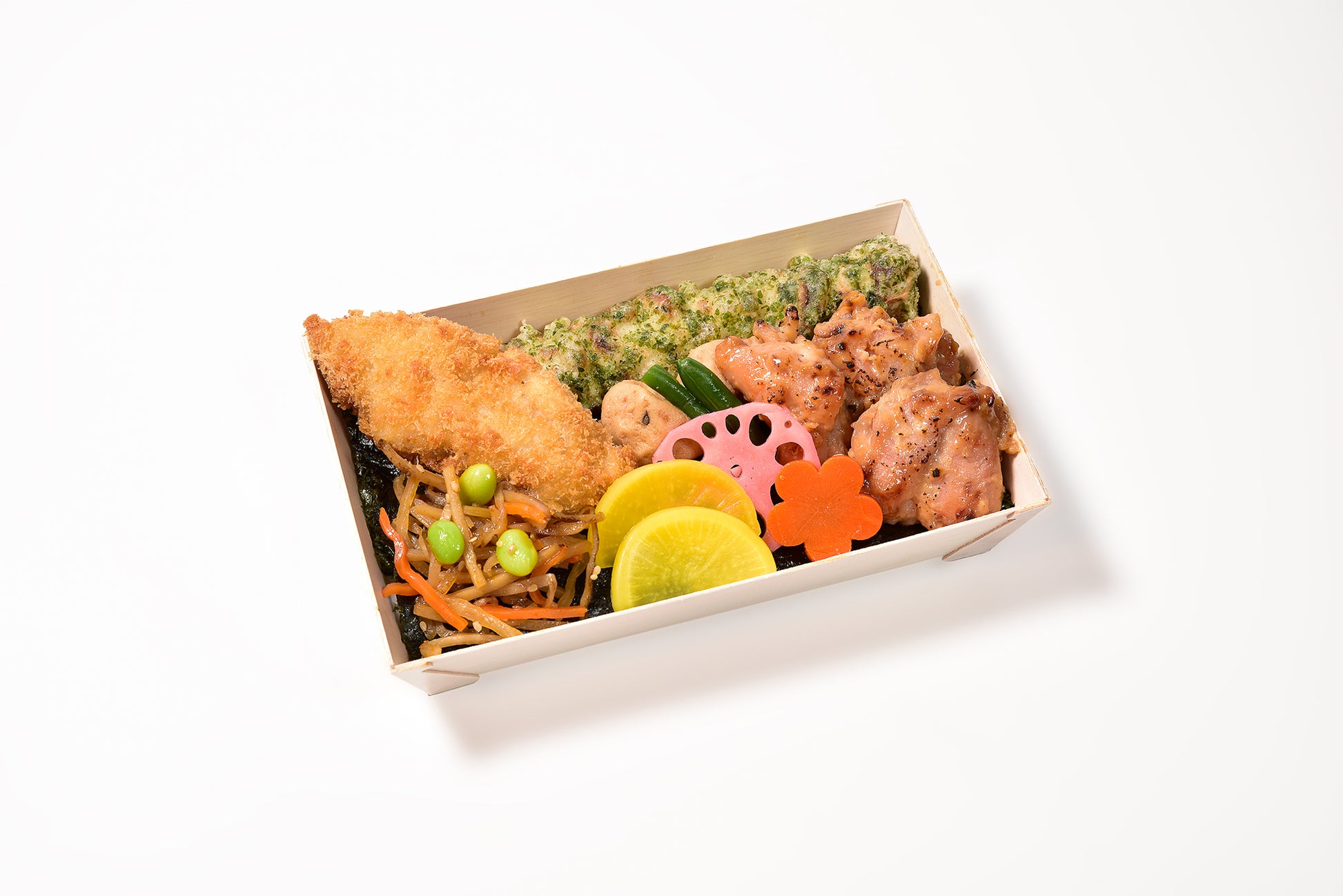 佐原から取り寄せた粉醤油で香ばしく仕上げた白身フライに、旨みたっぷりの鶏もも西京焼きを添えた特製のり弁です。